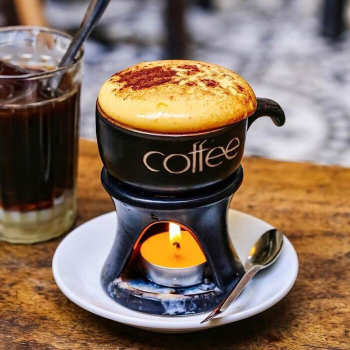 A Hanoi specialty — whipped egg yolk over strong Vietnamese coffee.